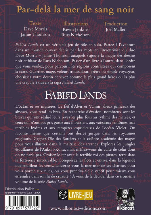 Fabled Lands est un véritable jeu de rôle en solo. Partez à l’aventure dans un monde ouvert décrit par les mots et l’inventivité du duo Dave Morris – Jamie Thomson auxquels s’ajoute la magie des dessins noir et blanc de Russ Nicholson. Passez d’un livre à l’autre, dans l’ordre que vous voulez, pour parcourir les régions contrastées qui composent la carte. Guerrier, mage, voleur, troubadour, prêtre ou simple voyageur, choisissez votre destin et vivez comme le plus grand héros ou la plus vile crapule à travers la saga Fabled Lands. Par-delà la mer de sang noir est un tome pivot de la série : il permet de naviguer sur l’océan Violet et donc de relier par mer la majorité des tomes de la série. Quêtes variées, exploration, trésors, commerce, pirates, pièges, école de magie, etc. Vous pourrez profiter de ce tome de diverses manières, tout dépendra du profil de votre personnage et de ses objectifs. À moins que les dangers de l’océan aient raison de lui...