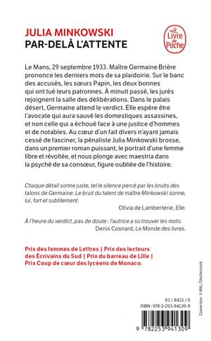 Le Mans, 29 septembre 1933. Maître Germaine Brière prononce les derniers mots de sa plaidoirie. Sur le banc des accusés, les sœurs Papin, les deux bonnes qui ont tué leurs patronnes. Il est minuit passé, les jurés rejoignent la salle des délibérations. Dans le palais désert, Germaine attend le verdict. Elle espère être l’avocate qui aura sauvé les domestiques assassines, et non celle qui a échoué face à une justice d’hommes et de notables. Au cœur d’un fait divers n’ayant jamais cessé de fasciner, Julia Minkowski brosse, dans un premier roman puissant, le portrait d’une femme libre et révoltée, et nous plonge avec maestria dans la psyché de sa consœur, figure oubliée de l’histoire.