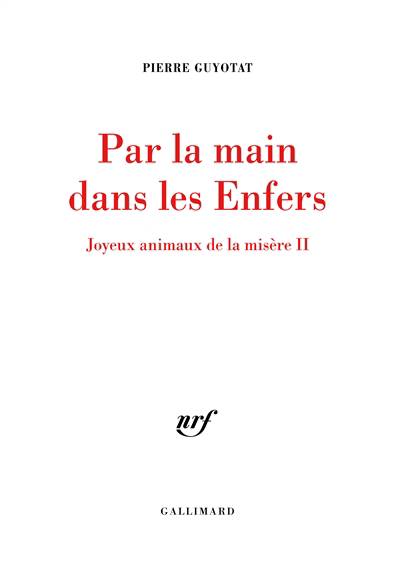 "Une mégalopole à la jonction de trois continents, d'océans, de cordillères ; mégapoles, bras de mer, fleuves, massifs, pics, glaciers, terres riveraines sous montée des eaux ; enchevêtrements de voies au sol et suspendues ; tours de verre, temples, ports, théâtres sur l'eau, habitats de pilotis, décharges-montagnes ; rats, chiens, rapaces diurnes et nocturnes, singes, serpents, fauves. Guerres, asservissements, peu de zones libres, très peu d'humanité paisible. En bordure d'un district de l'une des cités-mégapoles qui constituent la mégalopole, et devant une zone de chantiers portuaires, dans un ancien bar avec habitation à l'étage, un bordel. Un maître, fils de l'ancien tenancier, y possède trois putains : une petite femelle, muette, étendue à l'étage, deux mâles - celui, sans nom, qu'il a hérité de son père et l'un des très nombreux "petits" de ce mâle, épars dans les mégapoles : nommé, lui, Rosario. Ni "clients" ni "prostitué(e)s", figures et termes d'une sociologie et d'un érotisme désuets ; mais "ouvriers", "tâcherons" - presque tous bons époux et bons pères - et "putains" ou "mâles" et "femelles" ; humains et non-humains. La première partie de Joyeux animaux de la misère s'achevait provisoirement sur la copulation de Rosario avec sa génitrice en activité dans un bordel d'un lointain massif minier : une progéniture en est attendue. Cette deuxième partie, Par la main dans les Enfers, met en scène, en voix, entre autres, la castration, dans une rixe, du géniteur de Rosario puis le transport "sanitaire" du castrateur, pauvre ouvrier tueur de rats la nuit, aveuglé par ses rats en rage, vers des "urgences" d'accès difficile, à travers stupre, massacre et beauté." Pierre Guyotat.