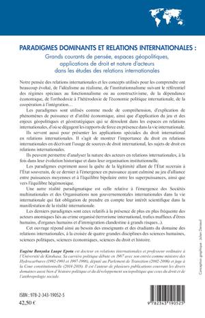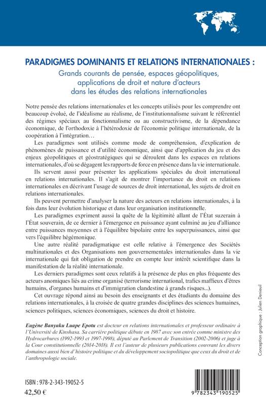 Notre pensée des relations internationales et les concepts utilisés pour les comprendre ont beaucoup évolué. Les paradigmes sont utilisés comme mode de compréhension, d'explication de phénomènes de puissance et d'utilité économique, ainsi que d'application du jeu et des enjeux géopolitiques et géostratégiques qui se déroulent dans les espaces en relations internationales. Ils servent aussi pour présenter les applications spéciales du droit international en relations internationales. Ils peuvent permettre d'analyser la nature des acteurs en relations internationales, à la fois dans leur évolution historique et dans leur organisation institutionnelle.