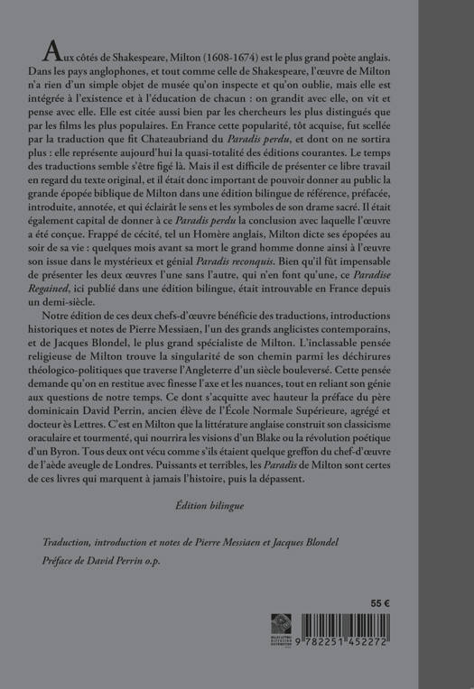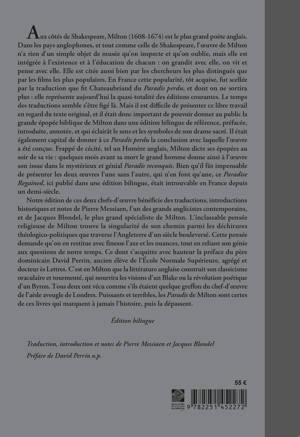 Edition bilingue Aux cotes de Shakespeare, Milton (1608-1674) est le plus grand poete anglais. Dans les pays anglophones, et tout comme celle de Shakespeare, l'oeuvre de Milton n'a rien d'un simple objet de musee qu'on inspecte et qu'on oublie, mais elle est integree a l'existence et a l'education de chacun: on grandit avec elle, on vit et pense avec elle. Elle est citee aussi bien par les chercheurs les plus distingues que par les films les plus populaires. En France cette popularite, tot acquise, fut scellee par la traduction que fit Chateaubriand du Paradis perdu, et dont on ne sortira plus: elle represente aujourd'hui la quasi-totalite des editions courantes. Le temps des traductions semble s'etre fige la. Mais il est difficile de presenter ce libre travail en regard du texte original, et il etait donc important de pouvoir donner au public la grande epopee biblique de Milton dans une edition bilingue de reference, prefacee, introduite, annotee, et qui eclairat le sens et les symboles de son drame sacre. Il etait egalement capital de donner a ce Paradis perdu la conclusion avec laquelle l'oeuvre a ete concue. Frappe de cecite, tel un Homere anglais, Milton dicte ses epopees au soir de sa vie: quelques mois avant sa mort le grand homme donne ainsi a l'oeuvre son issue dans le mysterieux et genial Paradis reconquis. Bien qu'il fut impensable de presenter les deux oeuvres l'une sans l'autre, qui n'en font qu'une, ce Paradise Regained, ici publie dans une edition bilingue, etait introuvable en France depuis un demi-siecle. Notre edition de ces deux chefs-d'oeuvre beneficie des traductions, introductions historiques et notes de Pierre Messiaen, l'un des grands anglicistes contemporains, et de Jacques Blondel, le plus grand specialiste de Milton. L'inclassable pensee religieuse de Milton trouve la singularite de son chemin parmi les dechirures theologico-politiques que traverse l'Angleterre d'un siecle bouleverse. Cette pensee demande qu'on en restitue avec finesse l'axe et les nuances, tout en reliant son genie aux questions de notre temps. Ce dont s'acquitte avec hauteur la preface du pere dominicain David Perrin, ancien eleve de l'Ecole Normale Superieure, agrege et docteur es Lettres. C'est en Milton que la litterature anglaise construit son classicisme oraculaire et tourmente, qui nourrira les visions d'un Blake ou la revolution poetique d'un Byron. Tous deux ont vecu comme s'ils etaient quelque greffon du chef-d'oeuvre de l'aede aveugle de Londres. Puissants et terribles, les Paradis de Milton sont certes de ces livres qui marquent a jamais l'histoire, puis la depassent.