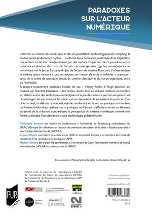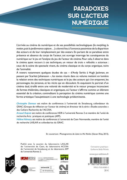 L'arrivée au cinéma du numérique et de ses possibilités technologiques (le morphing, la motion, puis la performance capture...) a donné lieu à l'annonce pessimiste de la disparition des acteurs et de leur remplacement par des avatars. En partant de ce paradoxe entre présence et absence du corps de l'acteur, cet ouvrage interroge les conséquences du numérique sur le jeu et l'analyse du jeu de l'acteur de cinéma. Pour cela, il observe dans le cinéma ayant recours à ces techniques, un retour de trois « refoulés » actoraux : ceux de la scène de spectacle vivant, du cinéma classique et du corps organique, voire de l'animalité.