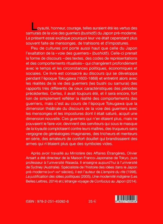 Loyaute, honneur, courage, telles auraient ete les vertus des samurais de la voie des guerriers (bushido) du Japon pre-moderne. Le present essai explique pourquoi leur vie etait cependant plus souvent faite de mensonges, de trahisons et d'impostures. Peu de cultures ont porte aussi haut que celle du Japon l'exaltation de la voie des guerriers (bushido). Celle-ci prenait la forme de discours - des textes, des codes de representations et des comportements ritualises - qui changerent profondement avec le temps et les circonstances politiques, economiques et sociales. Ce livre est consacre au discours qui se developpa pendant l'epoque Tokugawa (1603-1868) et entretint alors avec les realites de la vie des guerriers (les bushi ou samurai) des rapports tres differents de ceux caracteristiques des periodes precedentes. Certes, il avait toujours ete, et il sera encore, fort loin de simplement refleter la realite des comportements des guerriers, mais c'est au cours de l'epoque Tokugawa que la dimension theatrale du discours de la voie des guerriers avec les mensonges et les impostures dont il etait sature, acquit une dimension nouvelle. Ces guerriers qui n'en etaient plus, mais ne pouvaient le faire voir, devinrent des serviteurs qui sous le masque de la loyaute complotaient contre leurs maitres, des truqueurs sans vergogne de genealogies imaginaires, des tricheurs et menteurs en serie, des amateurs de confort douillet qui brandissaient des armes qui n'etaient plus que des symboles vides.