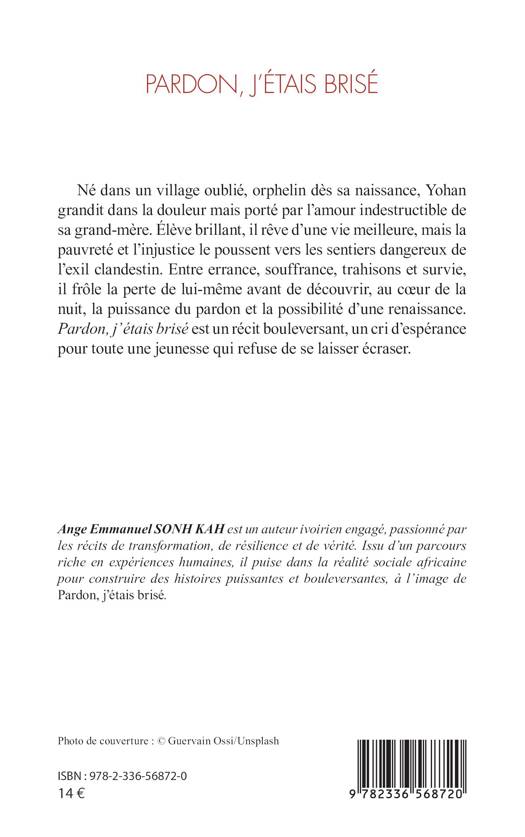 Né dans un village oublié, orphelin dès sa naissance, Yohan grandit dans la douleur mais porté par l'amour indestructible de sa grand-mère. Élève brillant, il rêve d'une vie meilleure, mais la pauvreté et l'injustice le poussent vers les sentiers dangereux de l'exil clandestin. Entre errance, souffrance, trahisons et survie, il frôle la perte de lui-même avant de découvrir, au coeur de la nuit, la puissance du pardon et la possibilité d'une renaissance. Pardon, j'étais brisé est un récit bouleversant, un cri d'espérance pour toute une jeunesse qui refuse de se laisser écraser.