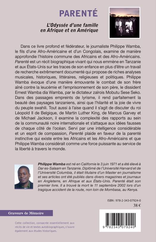 Dans ce livre profond et fédérateur, le journaliste Philippe Wamba, fils d'une Afro-Américaine et d'un Congolais, examine l'histoire commune des Africains et des Afro-Américains. Parenté est un récit biographique vivant qui nous emmène en Tanzanie et aux États-Unis sur les traces de son enfance, en plus d'être un travail de recherche très documenté qui propose de riches analyses musicales, historiques, littéraires, religieuses et politiques.