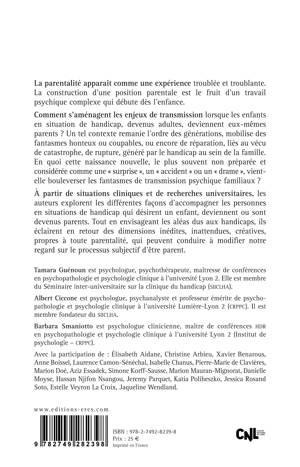 Comment s’aménagent les enjeux de transmission lorsque les enfants en situation de handicap, devenus adultes, deviennent eux-mêmes parents ? Un tel contexte remanie l’ordre des générations, mobilise des fantasmes honteux ou coupables, ou encore de réparation, liés au vécu de catastrophe, de rupture, généré par le handicap au sein de la famille. En quoi cette naissance nouvelle, le plus souvent non préparée et considérée comme une « surprise », un « accident » ou un « drame », vient-elle bouleverser les fantasmes de transmission psychique familiaux ?