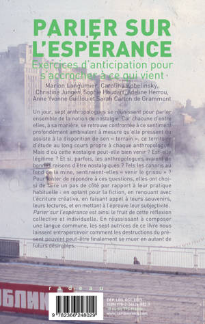 Un jour, sept anthropologues se réunissent pour parler ensemble de la notion de nostalgie. Car chacune d'entre elles, à sa manière, se retrouve confrontée à ce sentiment profondément ambivalent à mesure qu'elle pressent ou assiste à la disparition de son « terrain », ce territoire d'étude au long cours propre à chaque anthropologue. Mais d'où cette nostalgie peut-elle bien venir ? Est- elle légitime ? Et si, parfois, les anthropologues avaient de bonnes raisons d'être nostalgiques ? Tels les canaris au fond de la mine, sentiraient-elles « venir le grisou » ? Pour tenter de répondre à ces questions, elles ont choisi de faire un pas de côté par rapport à leur pratique habituelle : en optant pour la fiction, en renouant avec l'écriture créative, en faisant appel à leurs souvenirs, leurs lectures, et en mettant à l'épreuve leur subjectivité. "Parier sur l'espérance" est ainsi le fruit de cette réflexion collective et individuelle. En réussissant à composer une langue commune, les sept autrices de ce livre nous laissent entrapercevoir comment les destructions du présent peuvent peut-être finalement se muer en autant de futurs désirables.