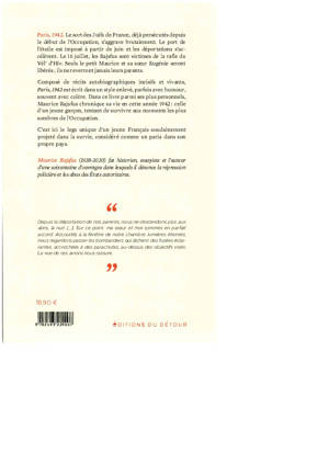 Composé de récits courts, vivants, Paris, 1942 est écrit dans un style enlevé, parfois avec humour, souvent avec colère. Il permet de saisir de façon sensible le quotidien — dans la rue, le métro ou chez le joaillier où l’auteur fait son apprentissage… — d’un jeune garçon tentant de survivre aux moments les plus sombres de l’Occupation.