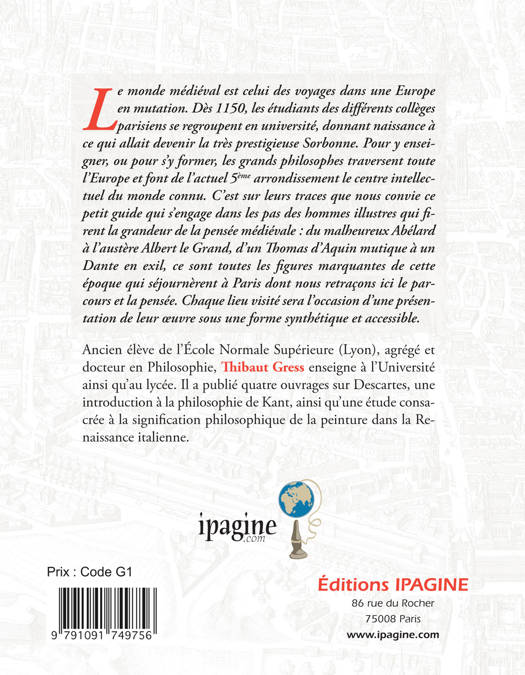 Le monde médiéval est celui des voyages dam une Europe en mutation. Dès 1150, les étudiants des différents collèges parisiens se regroupent en université, donnant naissance à ce qui allait devenir la très prestigieuse Sorbonne. Pour y enseigner, ou pour s'y former, les grands philosophes traversent toute l'Europe et font de l'actuel 5ème arrondissement le centre intellectuel du monde connu. C'est sur leurs traces que nous convie ce petit guide qui s'engage dans les pas des hommes illustres qui firent la grandeur de la pensée médiévale : du malheureux Abélard à l'austère Albert le Grand, d'un Thomas d'Aquin mutique à un Dante en exil, ce sont toutes les figures marquantes de cette époque qui séjournèrent à Paris dont nous retraçons ici le parcours et la pensée. Chaque lieu visité sera l'occasion d'une présentation de leur oeuvre sous une forme synthétique et accessible.