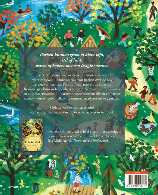 Parken kunnen groot of klein zijn, stil of luid, zonnig of bedekt met een laagje sneeuw. Met zijn kleurrijke, zwierige illustraties neemt Marc Majewski je mee op reis naar parken over de hele wereld: van Central Park in New York en de Keukenhof in Nederland, tot de Serengeti in Tanzania – en alles daartussenin. Dit prachtige non-fictieprentenboek is een liefdesverklaring aan parken en de manier waarop ze mensen, dieren en natuur samenbrengen – om te spelen, elkaar te ontmoeten of om stil te genieten.