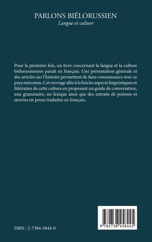 Pour la première fois, un livre concernant la langue et la culture biélorussiennes paraît en français. Une présentation générale et des articles sur l'histoire permettent de faire connaissance avec ce pays méconnu. Cet ouvrage allie à la fois les aspects linguistiques et littéraires de cette culture en proposant guide de conversation, grammaire, lexique ainsi que des extraits de poèmes et oeuvres en prose traduites en français.