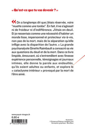 « On a longtemps dit que j'étais réservée, voire "muette comme une tombe". En fait, il ne s'agissait ni de froideur ni d'indifférence. J'étais en deuil. Et je ressentais comme une nécessité d'habiter un monde lisse, impersonnel et protecteur vis-à-vis, non pas de la mort, mais de la séparation qu'elle inflige avec la disparition de l'autre. » La grande psychanalyste Ginette Raimbault a consacré sa vie aux questions du deuil et de la mort. Dans ce livre limpide, émouvant, où s'entremêlent avec finesse expérience personnelle, témoignages et journaux intimes, elle donne la parole aux endeuillés, qu'ils soient adultes ou enfants, et explore le « cataclysme intérieur » provoqué par la mort de l'être aimé.