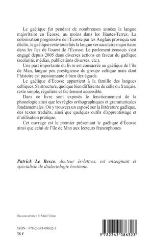 Le gaélique fut pendant de nombreuses années la langue majoritaire en Écosse, au moins dans les Hautes-Terres. La colonisation progressive de l'Écosse par les Anglais provoqua son déclin. Le parlement écossais s'est engagé depuis 2005 dans diverses actions en faveur du gaélique (scolarité, médias, publications diverses etc.). Une part importante du livre est également consacrée au gaélique de l'île de Man, langue peu prestigieuse du groupe celtique mais dont l'histoire est passionnante à bien des égards. Dans ce livre sont exposés le fonctionnement de la phonologie ainsi que les règles orthographiques et grammaticales fondamentales. On y trouvera un exposé sur la littérature gaélique, des textes traduits, ainsi que quelques outils d'apprentissage et d'utilisation pratique.