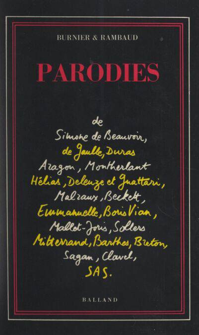 La farce des choses de Simone de Beauvoir / Aer voulez de Per Jakez Hélias / Mirot chinois mon amour de Marguerite Duras / Comme un vol de pavés de Louis Aragon / Les culottes courtes d’Henry de Montherlant / Deux roues et cycloversalité de G. Deleuze et F. Guattari / Le chien des limbes d’André Malraux / Le retour de Godot de Samuel Beckett / Emmanuelle dans l'autorail d’Emmanuelle Arsan / Madame Bovary de B. Vian, F. Mallet-Joris, Ph. Sollers / Le tronc et l’écorce de François Mitterrand / Le niveau zéro de Roland Barthes / Retour à l’envoyeur d’André Breton / Un navire dans tes yeux de Françoise Sagan / Satan est satan, par satan ! de Maurice Clavel / SAS, la tigresse de Pékin de Gérard de Villiers / Vers la cime de Charles de Gaulle