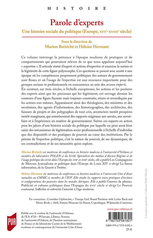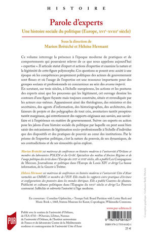 Ce volume interroge la présence à l'époque moderne de pratiques et de comportements qui pourraient relever de ce que nous appelons aujourd'hui « expertise ». Il articule statut d'expert et actions d'expertise et examine la nature et la légitimité de cette figure polymorphe. Ces questions se posent avec acuité à une époque où les compétences proprement politiques des acteurs de gouvernement sont floues et où l'usage de l'expertise est une ressource importante pour des groupes sociaux et professionnels en concurrence au sein des arcana imperii.