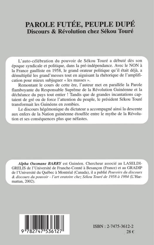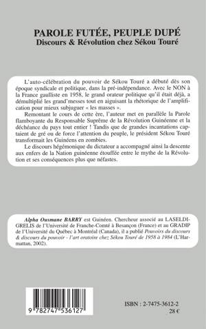 L'auto-célébration du pouvoir de Sékou Touré a débuté dès son époque syndicale et politique, dans la pré-indépendance. Le grand orateur politique a démultiplié les grand'messes tout en aiguisant la rhétorique de l'amplification pour mieux subjuguer "les masses". L'auteur met en parallèle la Parole flamboyante du responsable Suprême de la révolution Guinéenne et la déchéance du pays tout entier ! Le discours hégémonique du dictateur a accompagné ainsi la descente aux enfers de la Nation guinéenne étouffée entre le mythe de la révolution et ses conséquences plus que néfastes.