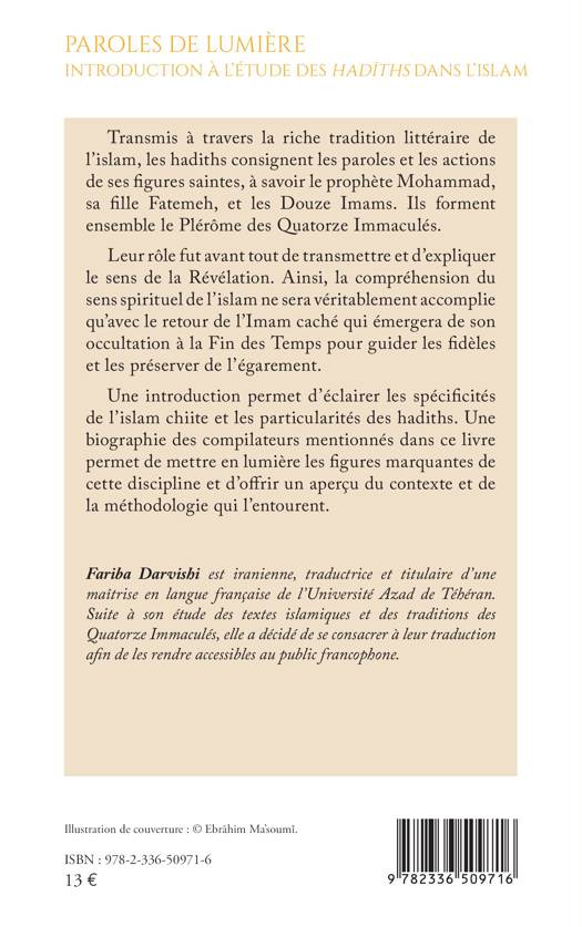 Transmis à travers la riche tradition littéraire de l'islam, les hadiths consignent les paroles et les actions de ses figures saintes, à savoir le prophète Mohammad, sa fille Fatemeh, et les Douze Imams. Ils forment ensemble le Plérôme des Quatorze Immaculés. Leur rôle fut avant tout de transmettre et d'expliquer le sens de la Révélation. Ainsi, la compréhension du sens spirituel de l'islam ne sera véritablement accomplie qu'avec le retour de l'Imam caché qui émergera de son occultation à la Fin des Temps pour guider les fidèles et les préserver de l'égarement. Une introduction permet d'éclairer les spécificités de l'islam chiite et les particularités des hadiths. Une biographie des compilateurs mentionnés dans ce livre permet de mettre en lumière les figures marquantes de cette discipline et d'offrir un aperçu du contexte et de la méthodologie qui l'entourent.