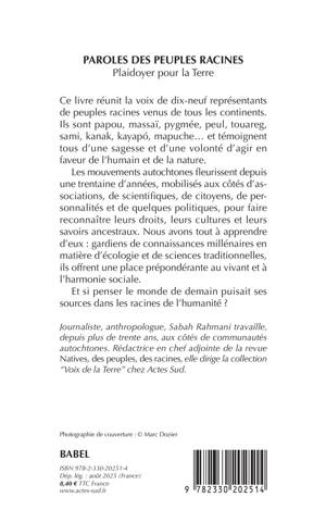 Ce livre réunit la voix de dix-neuf représentants de peuples racines venus de tous les continents. Ils sont papou, massaï, pygmée, peul, touareg, sami, kanak, kayapó, mapuche... et témoignent tous d'une sagesse et d'une volonté d'agir en faveur de l'humain et de la nature. Les mouvements autochtones fleurissent depuis une trentaine d'années, mobilisés aux côtés d'associations, de scientifiques, de citoyens, de personnalités et de quelques politiques, pour faire reconnaître leurs droits, leurs cultures et leurs savoirs ancestraux. Nous avons tout à apprendre d'eux : gardiens de connaissances millénaires en matière d'écologie et de sciences traditionnelles, ils offrent une place prépondérante au vivant et à l'harmonie sociale. Et si penser le monde de demain puisait ses sources dans les racines de l'humanité ?
