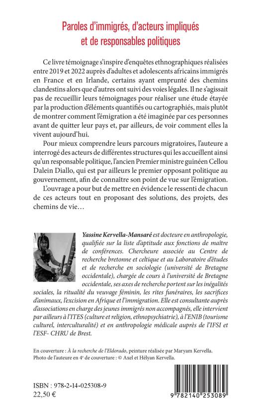 Ce livre témoignage s'inspire d'enquêtes ethnographiques réalisées entre 2019 et 2022 auprès d'adultes et adolescents africains immigrés en France et en Irlande, certains ayant emprunté des chemins clandestins alors que d'autres ont suivi des voies légales. Il ne s'agissait pas de recueillir leurs témoignages pour réaliser une étude étayée par la production d'éléments quantifiés ou cartographiés, mais plutôt de montrer comment l'émigration a été imaginée par ces personnes avant de quitter leur pays et, par ailleurs, de voir comment elles la vivent aujourd'hui. Pour mieux comprendre leurs parcours migratoires, l'auteure a interrogé des acteurs de différentes structures qui les accueillent ainsi qu'un responsable politique, l'ancien Premier ministre guinéen Cellou Dalein Diallo, qui est par ailleurs le premier opposant politique au gouvernement, afin de connaître son point de vue sur l'émigration. L'ouvrage a pour but de mettre en évidence le ressenti de chacun de ces acteurs tout en proposant des solutions, des projets, des chemins de vie.