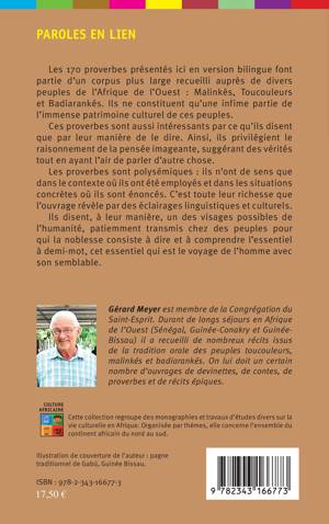 Les 170 proverbes présentés ici en version bilingue font partie d'un corpus plus large recueilli auprès de divers peuples de l'Afrique de l'Ouest : Malinkés, Toucouleurs et Badiarankés. Ils ne constituent qu'une infime partie de l'immense patrimoine culturel de ces peuples. Les proverbes sont polysémiques : ils n'ont de sens que dans le contexte où ils ont été employés et dans les situations concrètes où ils sont énoncés. C'est toute leur richesse que l'ouvrage révèle par des éclairages linguistiques et culturels.