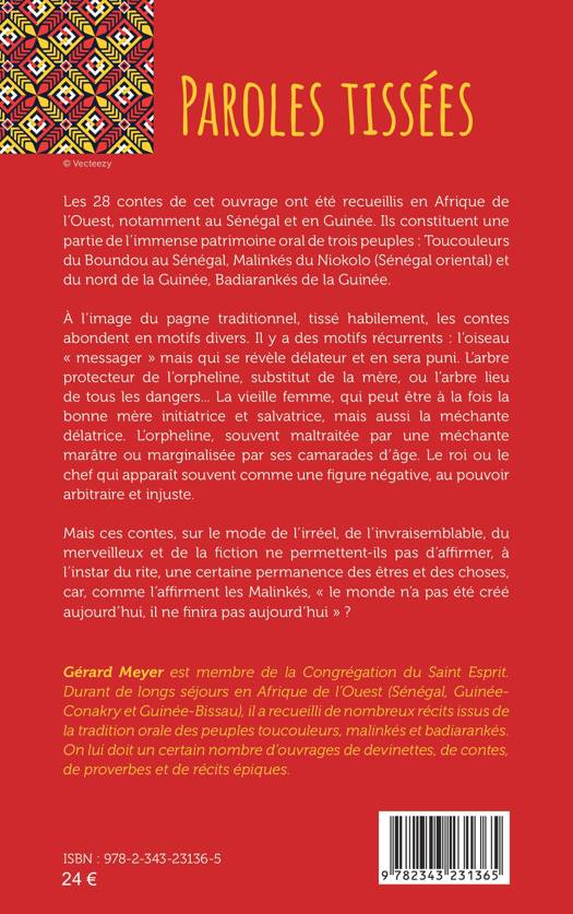 Les 28 contes présents ici sont originaires du Sénégal et de la Guinée. Ils constituent une partie de l’immense patrimoine oral de trois peuples : Toucouleurs du Boundou au Sénégal, Malinkés du Niokolo et du nord de la Guinée, Badiarankés de la Guinée. À l’image du pagne traditionnel, tissé habilement, les contes abondent en motifs divers. Il y a des motifs récurrents : l’oiseau « messager » mais délateur, l’arbre protecteur, l’orpheline, la vieille femme, marâtre ou bonne mère, le roi ou le chef, figure injuste. Mais ces contes ne permettent-ils pas d’affirmer, à l’instar du rite, une certaine permanence des êtres et des choses, une tradition qui persiste?