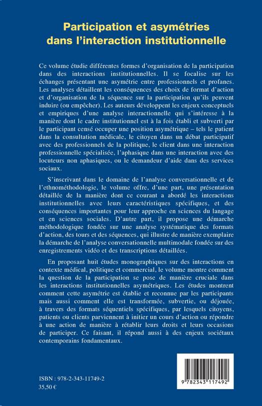 Ce volume étudie différentes formes d'organisation de la participation dans des interactions institutionnelles. Il se focalise sur les échanges présentant une asymétrie entre professionnels et profanes. S'inscrivant dans le domaine de l'analyse conversationnelle et de l'ethnométhodologie, il offre une présentation détaillée de la manière dont ce courant a abordé les interactions institutionnelles avec leurs caractéristiques spécifiques. En proposant huit études monographiques sur des interactions en contexte médical, politique et commercial, cet ouvrage montre comment la question de la participation se pose de manière cruciale dans les interactions institutionnelles asymétriques.