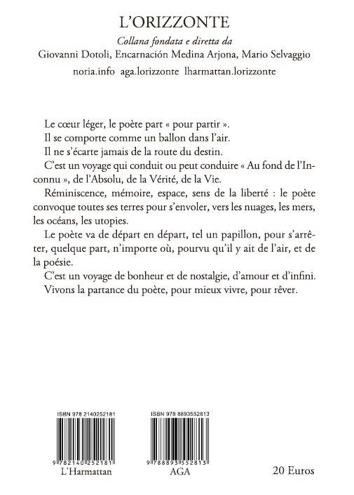 Le coeur léger, le poète part « pour partir ». Il se comporte comme un ballon dans l'air. Il ne s'écarte jamais de la route du destin. C'est un voyage qui conduit ou peut conduire « Au fond de l'Inconnu », de l'Absolu, de la Vérité, de la Vie. Réminiscence, mémoire, espace, sens de la liberté : le poète convoque toutes ses terres pour s'envoler, vers les nuages, les mers, les océans, les utopies. Le poète va de départ en départ, tel un papillon, pour s'arrêter, quelque part, n'importe où, pourvu qu'il y ait de l'air, et de la poésie. C'est un voyage de bonheur et de nostalgie, d'amour et d'infini. Vivons la partance du poète, pour mieux vivre, pour rêver.