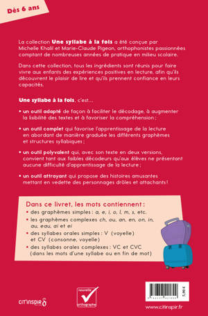 Série rouge Fossile rêve de faire un safari, mais ne peut pas prendre l’avion ! Dans ce livre, les mots contiennent : des graphèmes simples : a, e, i, o, l, m, s, etc. les graphèmes complexes ch, ou, an, en, on, in, au, eau, ai et ei des syllabes orales simples : V (voyelle) et CV (consonne, voyelle) des syllabes orales complexes : VC et CVC (dans les mots d’une syllabe ou en fin de mot) Des textes adaptés pour lire plus facilement ! Pour faciliter l’apprentissage de la lecture, les mots qui composent les histoires ont été sélectionnés en fonction de leur familiarité, de leur structure syllabique et des graphèmes* qu’ils contiennent. Plusieurs adaptations visuelles permettent de réduire la charge cognitive liée au décodage et de limiter l’encombrement perceptif. Les livrets contiennent deux fois la même histoire : dans la première version, syllabes orales, lettres muettes et graphèmes complexes sont mis en relief ; dans la seconde, ces adaptations ne sont pas présentes. Ce sont donc des outils polyvalents qui favorisent le transfert des acquis et qui conviennent à tous les enfants. Les histoires fantaisistes mettent en scène des personnages rigolos et attachants. La trame narrative captive les jeunes lecteurs tout en leur permettant de faire des prédictions. Les illustrations leur donnent aussi de nombreuses occasions de faire des inférences.