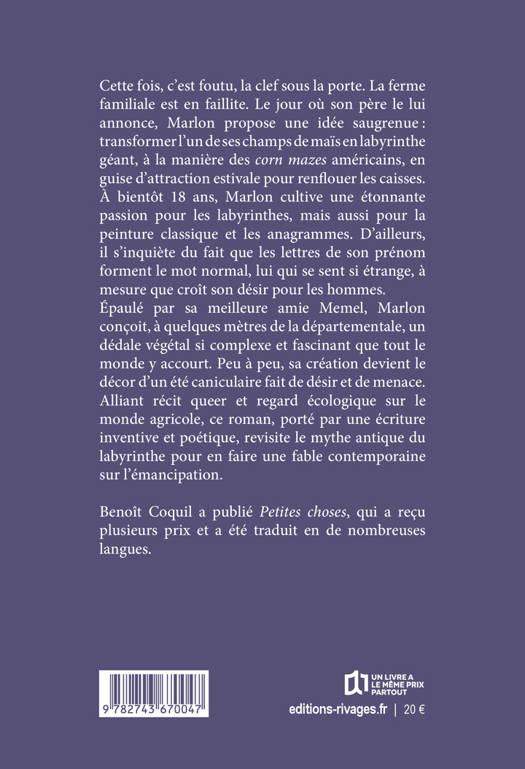 Cette fois, c'est foutu, la clef sous la porte. La ferme familiale est en faillite. Le jour où son père le lui annonce, Marlon propose une idée saugrenue : transformer l'un de ses champs de maïs en labyrinthe géant, à la manière des corn mazes américains, en guise d'attraction estivale pour renflouer les caisses. À bientôt 18 ans, Marlon cultive une étonnante passion pour les labyrinthes, mais aussi pour la peinture classique et les anagrammes. D'ailleurs, il s'inquiète du fait que les lettres de son prénom forment le mot normal, lui qui se sent si étrange, à mesure que croît son désir pour les hommes. Épaulé par sa meilleure amie Memel, Marlon conçoit, à quelques mètres de la départementale, un dédale végétal si complexe et fascinant que tout le monde y accourt. Peu à peu, sa création devient le décor d'un été caniculaire fait de désir et de menace. Alliant récit queer et regard écologique sur le monde agricole, ce roman, porté par une écriture inventive et poétique, revisite le mythe antique du labyrinthe pour en faire une fable contemporaine sur l'émancipation.