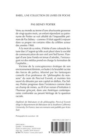 Victime de la concupiscence érotique de son environnement féminin, en butte à la brutalité raciste des forces de police, tétanisé par les fantasques conseils d'un professeur de "philosophie du non-sens" du nom de Percival Everett, et maintes fois sauvé du désastre par son capital en dollars, «Pas» «Sidney Poitier» progresse dans l'existence comme dans un champ de mines, au fil d'un roman d'initiation à l'humour grinçant, dans une Amérique contemporaine confrontée au pesant héritage de la question raciale.
