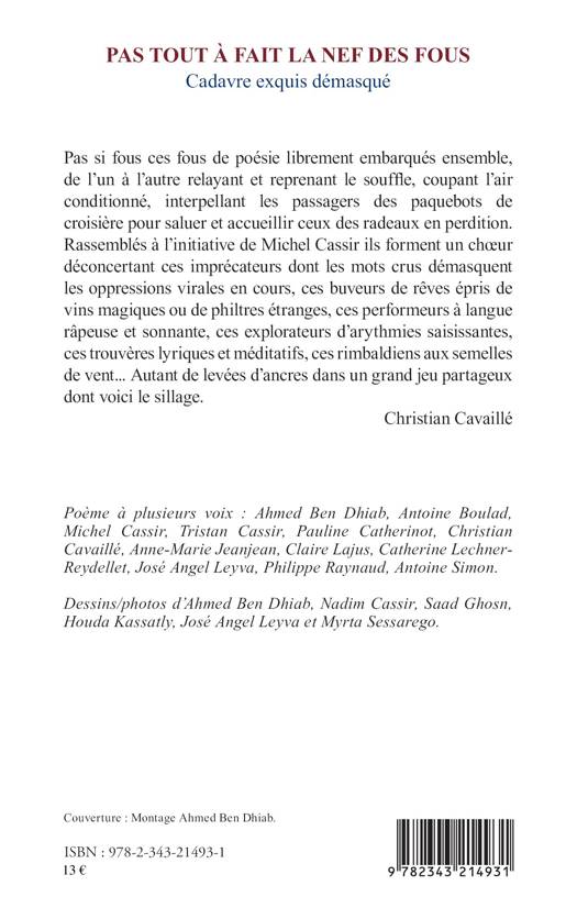 "Pas si fous ces fous de poésie librement embarqués ensemble, de l'un à l'autre relayant et reprenant le souffle, coupant l'air conditionné, interpellant les passagers des paquebots de croisière pour saluer et accueillir ceux des radeaux en perdition. Rassemblés à l'initiative de Michel Cassir ils forment un choeur déconcertant ces imprécateurs dont les mots crus démasquent les oppressions virales en cours, ces buveurs de rêves épris de vins magiques ou de philtres étranges, ces performeurs à langue râpeuse et sonnante, ces explorateurs d'arythmies saisissantes, ces trouvères lyriques et méditatifs, ces rimbaldiens aux semelles de vent... Autant de levées d'ancres dans un grand jeu partageux dont voici le sillage." Christian Cavaillé