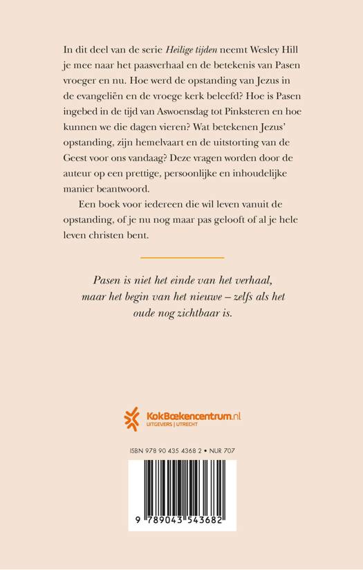 'Pasen. Een tijd van opstanding' van theoloog Wesley Hill is het tweede deel in de serie ‘Heilige tijden’, na 'Advent' van Tish Warren. Wesley Hill neemt je mee door het paasverhaal en de betekenis van Pasen vroeger en nu. Hoe werd de opstanding van Jezus in de evangeliën en de vroege kerk beleefd? Hoe is Pasen ingebed in de tijd van Aswoensdag tot Pinksteren – en hoe kunnen we die dagen vieren? Wat betekenen Jezus’ opstanding, zijn hemelvaart en de uitstorting van de Geest voor ons vandaag? Op deze vragen gaat de auteur op een prettige, persoonlijke en inhoudelijke manier in. Dit is geen veertigdagenboek, maar kan wel als zodanig gebruikt worden: het geeft verdieping en overdenking in de aanloop naar Pasen.