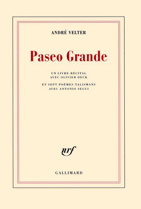 Paseo Grande, comme un pari fabuleux et fatal, sans fausseté ni repli possibles. Paseo Grande, comme un périple dans les périls où se réinvente le monde. Paseo Grande, comme un récital amorcé dans l’incessant va-et-vient de textes encore précaires et de mélodies soudaines. Ce livre est indissociable du mouvement complice qui l’a suscité et de l’environnement sonore, vocal et musical qui l’a inspiré. Les compositions et le chant d’Olivier Deck ont accompagné et parfois devancé l’écriture de ces ballades pareilles à des rêves éveillés, à des sursauts funestes, à des éclats de vie violente et fière. C’est pourquoi un tel recueil se devait, en plus d’être imprimé, de s’affranchir de son cadre et d’offrir, par une extension désormais possible du côté d’internet, quelques propositions d’écoute, quelques séquences filmées. S’aventurer ainsi en terrain découvert suggérait de s’adjoindre plusieurs talismans, aussi aléatoires que ceux qu’énumère Borges dans La rosa profunda, et les sept quatrains en images, réalisés avec Antonio Segui, ne comptent d’ailleurs que sur leur magie hasardeuse, explicitement ironique, pour assurer la protection rapprochée du Paseo Grande. A .V. Ce « livre-récital » né du spectacle initialement créé par André Velter et Olivier Deck pour l’ouverture du Festival Jazz Naturel d’Orthez 2009 constitue l’un des éléments d’une expérience de poésie interactive, avec un CD audio des 12 chansons tirées du récital et un site Internet présentant notamment des extraits du spectacle (site accessible à partir de mi-janvier 2011 via www.gallimard.fr et le lien Paseo Grande).