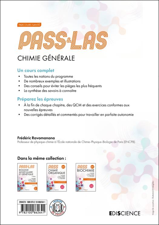 Destiné aux étudiants du Parcours d'accès spécifique santé (PASS), première année des études MMOPK (Médecine, Maïeutique, Odontologie, Pharmacie et Kiné) et aux étudiants de L.AS (Licences Accès Santé), ce manuel complet est conçu pour les aider à pour les aider à assimiler le cours de Chimie générale et à réussir leurs examens.