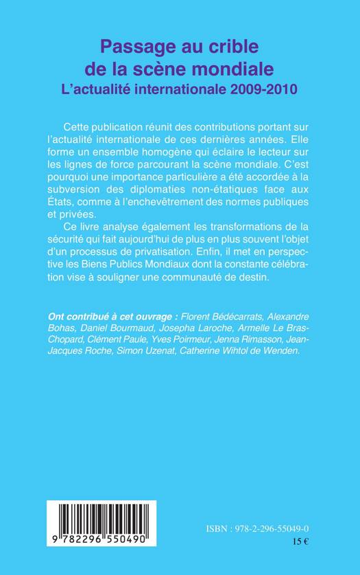 Réunissant des contributions sur l'actualité internationale de ces dernières années, cet ouvrage éclaire le lecteur sur les lignes de forces parcourant la scène mondiale, notamment la subversion des diplomaties non-étatiques face aux Etats, comme l'enchevêtrement des normes publiques et privées. Il analyse aussi le processus de privatisation de la sécurité, et met en perspective les Biens Publics Mondiaux.