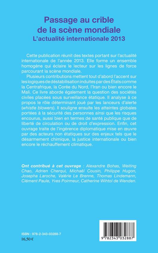 Ce livre met l'accent sur les logiques de déstabilisation induites par des Etats comme la Centrafrique, la Corée du Nord, l'Iran ou bien encore le Mali, et aborde la question des sociétés civiles placées sous surveillance étatique. Il souligne les atteintes globales portées à la sécurité des personnes, traite de l'ingérence diplomatique par des acteurs non étatiques dans les domaines du désarmement chimique, de la justice internationale ou du réchauffement climatique.