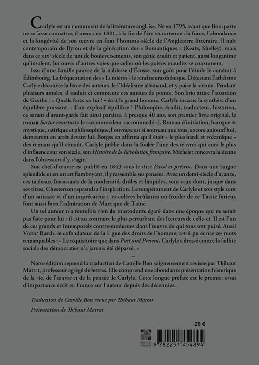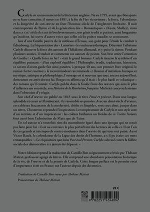 Carlyle est un monument de la litterature anglaise. Ne en 1795, avant que Bonaparte ne se fasse connaitre, il meurt en 1881, a la fin de l'ere victorienne: la force, l'abondance et la longevite de son oeuvre en font l'homme-siecle de l'Angleterre litteraire. Il nait contemporain de Byron et de la generation des " Romantiques " (Keats, Shelley), mais dans ce XIXe siecle de tant de bouleversements, son genie erudit et patient, aussi longanime qu'insolent, lui ouvre d'autres voies que celles ou les poetes maudits se consument. Issu d'une famille pauvre de la noblesse d'Ecosse, son gout pour l'etude le conduit a Edimbourg. La frequentation des " Lumieres " le rend neurasthenique. Detestant l'atheisme Carlyle decouvre la force des auteurs de l'Idealisme allemand, et y puise la sienne. Pendant plusieurs annees, il traduit et commente ces auteurs de pointe. Son brio attire l'attention de Goethe: " Quelle force en lui ! " ecrit le grand homme. Carlyle incarne la synthese d'un equilibre puissant - d'un explosif equilibre ! Philosophe, erudit, traducteur, historien, ce savant d'avant-garde fait ainsi paraitre, a presque 40 ans, son premier livre original, le roman Sartor resartus (" le raccommodeur raccommode "). Roman d'initiation, baroque et mystique, satirique et philosophique, l'ouvrage est si nouveau que tous, encore aujourd'hui, demeurent en arret devant lui. Borges en affirma qu'il etait " le plus hardi et volcanique " des romans qu'il connut. Carlyle publie dans la foulee l'une des oeuvres qui aura le plus d'influence sur son siecle, son Histoire de la Revolution francaise. Michelet concevra la sienne dans l'obsession d'y reagir. Son chef-d'oeuvre est publie en 1843 sous le titre Passe et present. Dans une langue splendide et en un art flamboyant, il y rassemble ses pensees. Avec un demi-siecle d'avance, ces tableaux fracassants de la modernite, droles et limpides, sont ceux dont, jusque dans ses titres, Chesterton reprendra l'inspiration. Le temperament de Carlyle et son style sont d'un satiriste et d'un imprecateur: les coleres brulantes ou froides de ce Tacite furieux font aussi bien l'admiration de Marx que de Taine. Un tel auteur n'a toutefois rien du mastodonte egare dans une epoque qui ne serait pas faite pour lui: il est au contraire le plus perturbant des lecteurs de celle-ci. Il est l'un de ces grands et intemporels contre-modernes dans l'oeuvre de qui tous ont puise. Aussi Victor Basch, le cofondateur de la Ligue des droits de l'homme, a-t-il pu ecrire ces mots remarquables: " Le requisitoire que dans Past and Present, Carlyle a dresse contre la faillite sociale des democraties n'a jamais ete depasse. " Notre edition reprend la traduction de Camille Bos soigneusement revisee par Thibaut Matrat, professeur agrege de lettres. Elle comprend une abondante presentation historique de la vie, de l'oeuvre et de la pensee de Carlyle. Cette longue preface est le premier essai d'importance ecrit en France sur l'auteur depuis des decennies.