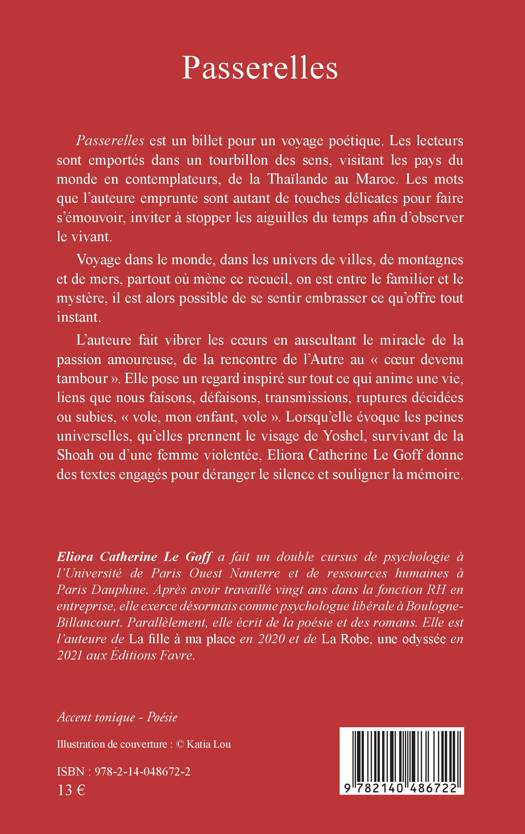 Passerelles est un billet pour un voyage poétique. Les lecteurs sont emportés dans un tourbillon des sens, visitant les pays du monde en contemplateurs, de la Thaïlande au Maroc. Les mots que l'auteure emprunte sont autant de touches délicates pour faire s'émouvoir, inviter à stopper les aiguilles du temps afin d'observer le vivant. Voyage dans le monde, dans les univers de villes, de montagnes et de mers, partout où mène ce recueil, on est entre le familier et le mystère, il est alors possible de se sentir embrasser ce qu'offre tout instant. L'auteure fait vibrer les cœurs en auscultant le miracle de la passion amoureuse, de la rencontre de l'Autre au « cœur devenu tambour ». Elle pose un regard inspiré sur tout ce qui anime une vie, liens que nous faisons, défaisons, transmissions, ruptures décidées ou subies, « vole, mon enfant, vole ». Lorsqu'elle évoque les peines universelles, qu'elles prennent le visage de Yoshel, survivant de la Shoah ou d'une femme violentée, Eliora Catherine Le Goff donne des textes engagés pour déranger le silence et souligner la mémoire.