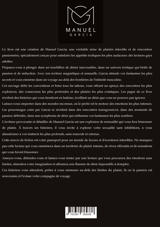 Ce livre est une création de Manuel Garcia, une véritable mine de plaisirs interdits et de rencontres passionnées, spécialement conçue pour satisfaire les appétits érotiques les plus audacieux des lecteurs gays adultes.Prépare-toi à te plonger dans un tourbillon de désirs inavouables, dans un univers érotique qui brûle de passion et de séduction. Avec son écriture magnétique et sensuelle, Garcia stimule tes fantasmes les plus secrets, t'emmenant dans un voyage au-delà des frontières de l'intimité masculine.Cet ouvrage défie les conventions et brise tous les tabous, t'offrant un aperçu des rencontres les plus explosives, des connexions les plus profondes et des plaisirs les plus extatiques. Les pages de ce livre révèlent des histoires qui te tiendront collé aux mots, éveillant un désir que tu ne pourras pas ignorer.Laisse-toi emporter dans des mondes inconnus, où le péché est le moteur des émotions les plus intenses. Les personnages créés par García se révèlent dans des rencontres transgressives, dans des moments de passion débridée, dans une symphonie de désir qui enflamme tes fantasmes les plus sombres.L'écriture provocante et détaillée de Manuel García est une explosion de sensualité qui te fera frissonner de plaisir. À travers ses histoires, il t'invite à explorer ta sexualité sans inhibitions, à t'abandonner à tes instincts les plus profonds, sans remords ni retenue.Cette oeuvre de fiction est ton passeport pour un monde de luxure et d'aventures interdites. Ne manque pas cette lecture qui t'emmènera dans un territoire de plaisir intense, de rêves effrontés et de sensations qui te feront frissonner.Assieds-toi, détends-toi et laisse-toi aller à une lecture qui te procurera des émotions sans limites, stimulera ton imagination et allumera une flamme de désir qui ne peut être apprivoisée.Ces histoires t'attendent, prêtes à t'emmener au-delà des limites du plaisir, là où la passion est souveraine et où l'extase est ton compagnon de voyage.
