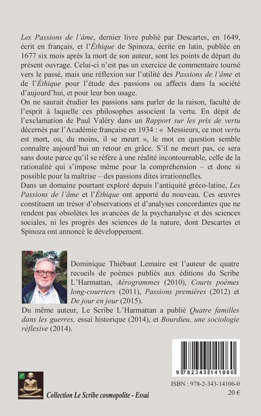L'apport de Descartes dans Les Passions de l'âme, et de Spinoza dans l' Ethique, constitue la base principale à partir de laquelle l'auteur réfléchit aux passions ou affects dans le monde actuel, et aux possibilités de leur bon usage. On ne saurait étudier les passions sans parler de la raison, qui s'impose même pour la compréhension (et si possible pour la maîtrise) de ce qui paraît irrationnel. Ces uvres soucieuses de se référer à l'expérience forment un ensemble d'analyses concordantes que ne rendent pas obsolètes les avancées des sciences humaines et sociales, ni les progrès des sciences de la nature, dont Descartes et Spinoza ont annoncé le développement.