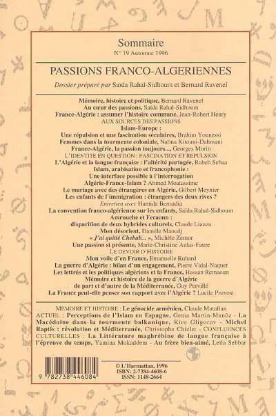 Cet ouvrage propose les articles suivants: France-Algérie: assumer l'histoire commune; Femmes dans la tourmente coloniale; France-Algérie, la pasison toujours; Les enfants de l'immigration: étrangers des deux rives? La guerre d'Algérie: bilan d'un engagement; la France peut-elle penser son rapport avec l'Algérie?