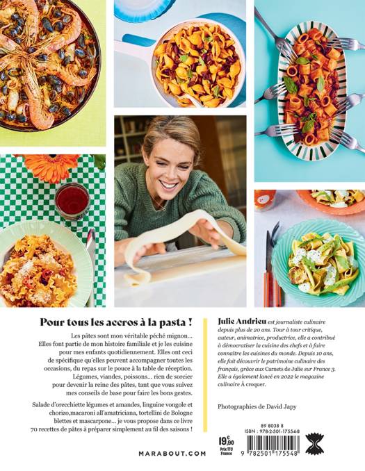 Salade d'orecchiette légumes et amandes, linguine vongole et chorizo, macaronis all'amatriciana, tortellinis de Bologne blettes et mascarpone... je vous propose dans ce livre 70 recettes de pâtes à préparer simplement au fil des saisons !