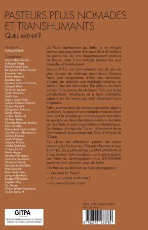 Les Peuls représentent au Sahel et en Afrique centrale une population d'environ 35 à 40 millions de personnes. Ils sont majoritairement pasteurs de bovins. Sept à huit millions d'entre eux sont nomades et transhumants. Depuis 2015, ces communautés sont de plus en plus victimes de violences meurtrières et certains Peuls sont soupçonnés d'être des terroristes. Par ailleurs, ils doivent faire preuve de résilience face aux fortes perturbations climatiques et à leurs inévitables impacts sur les ressources dont dépendent leurs troupeaux. Ce livre permet de mieux connaître les Peuls et les différentes facettes de leur identité, les problèmes liés au pastoralisme et à son devenir, enfin les débats sur la participation des Peuls au développement d'un djihadisme terroriste dans plusieurs pays du Sahel.