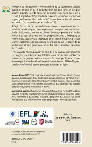 Patoiseries de « La Soutrane » (nom marchois de La Souterraine, Creuse), publié à l’origine en 1944, constitue l’un des plus longs et des plus anciens ouvrages écrits dans l’un des parlers du nord-ouest de la Creuse. Il s’agit d’une très importante ressource concernant le marchois, et plus généralement les parlers du Croissant (aire de transition entre les parlers d’oc, ou occitan, et les parlers d’oïl). L’ouvrage peut ainsi être mis en perspective avec la littérature de terroir, mais aussi avec la littérature en occitan limousin. Ce recueil fournit de précieuses informations sur les parlers marchois du milieu du XXe siècle. Cette nouvelle édition propose aussi une traduction en français, une introduction détaillée, ainsi qu’une transcription de trois textes en graphie occitane adaptée. En outre, plusieurs textes ont été enregistrés dans le cadre d’une émission de la radio RMJ de Magnac-Laval (Haute-Vienne), et sont proposés librement en ligne.