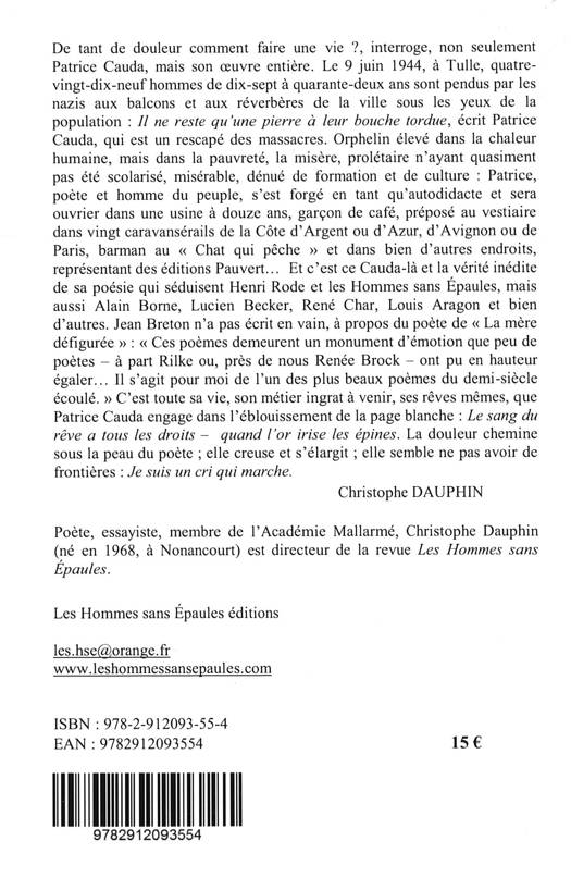 De tant de douleur comment faire une vie ? interroge, non seulement Patrice Cauda, mais son œuvre entière. Le 9 juin 1944, à Tulle, quatre-vingt-dix-neuf hommes de dix-sept à quarante-deux ans sont pendus par les nazis aux balcons et aux réverbères de la ville sous les yeux de la population : Il ne reste qu’une pierre à leur bouche tordue, écrit Patrice Cauda, qui est un rescapé des massacres.