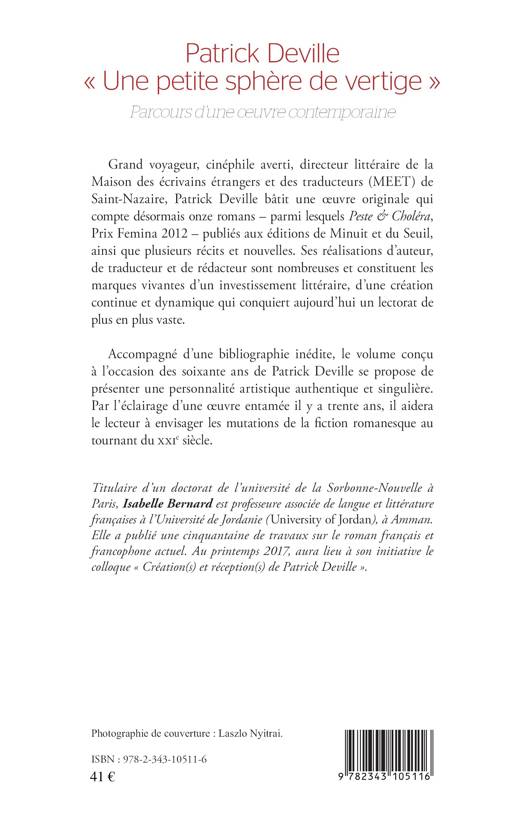 Grand voyageur, cinéphile averti, directeur littéraire de la Maison des écrivains étrangers et des traducteurs de Saint-Nazaire, Patrick Deville bâtit une oeuvre originale qui compte désormais onze romans (dont Peste & Choléra, Prix Femina 2012). Ses réalisations d'auteur, de traducteur et de rédacteur constituent les marques vivantes d'un investissement littéraire, d'une création continue et dynamique qui conquiert aujourd'hui un lectorat de plus en plus vaste. À l'occasion des soixante ans de Patrick Deville, cet ouvrage se propose de présenter une personnalité artistique authentique et singulière.