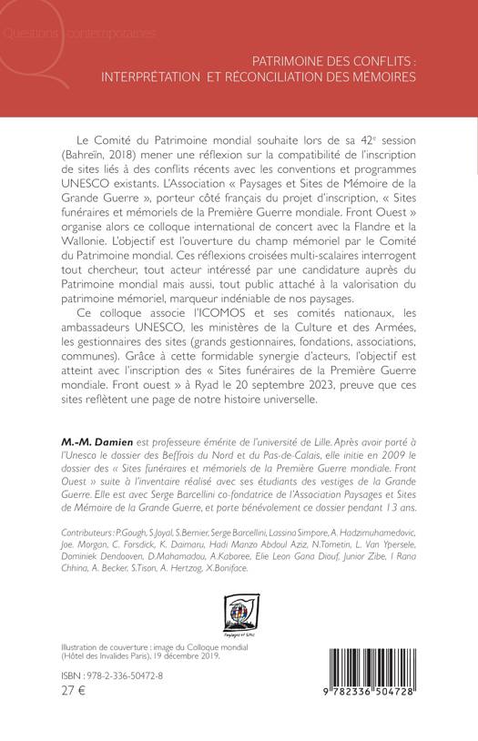 Le Comité du Patrimoine mondial souhaite lors de sa 42e session (Bahreïn, 2018) mener une réflexion sur la compatibilité de l'inscription de sites liés à des conflits récents avec les conventions et programmes UNESCO existants. L'Association Paysages et Sites de Mémoire de la Grande Guerre, porteur côté français du projet d'inscription, Sites funéraires et mémoriels de la Première Guerre mondiale. Front Ouest organise alors ce colloque international de concert avec la Flandre et la Wallonie. L'objectif est l'ouverture du champ mémoriel par le Comité du Patrimoine mondial. Ces réflexions croisées multi-scalaires interrogent tout chercheur, tout acteur intéressé par une candidature auprès du Patrimoine mondial mais aussi, tout public attaché à la valorisation du patrimoine mémoriel, marqueur indéniable de nos paysages. Ce colloque associe l'ICOMOS et ses comités nationaux, les ambassadeurs UNESCO, les ministères de la Culture et des Armées, les gestionnaires des sites (grands gestionnaires, fondations, associations, communes). Grâce à cette formidable synergie d'acteurs, l'objectif est atteint avec l'inscription des Sites funéraires de la Première Guerre mondiale. Front ouest à Ryad le 20 septembre 2023, preuve que ces sites reflètent une page de notre histoire universelle.