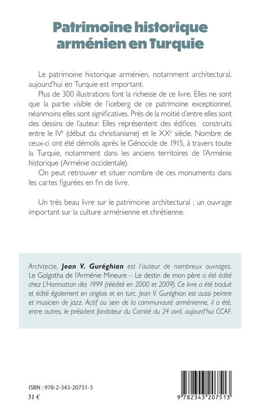 Le patrimoine historique arménien, notamment architectural, présent en Turquie est important. Plus de 300 illustrations, dont la moitié de l'auteur font la richesse de ce livre. Elles représentent des édifices construits entre le IVe (début du christianisme) et le XXe siècle. Nombre de ceux-ci ont été démolis après le Génocide de 1915, à travers toute la Turquie, notamment dans les anciens territoires de l'Arménie historique. On peut retrouver et situer nombre de ces monuments dans les cartes figurées en fin du livre.