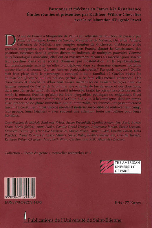 D'Anne de France à Marguerite de Valois et Catherine de Bourbon, en passant par Anne de Bretagne, Louise de Savoie, Marguerite de Navarre, Diane de Poitiers, Catherine de Médicis, sans compter nombre de duchesses, d'abbesses et de grandes bourgeoises, des femmes ont occupé en France, durant la Renaissance, des positions majeures dans la gestion directe ou indirecte de multiples pouvoirs. Comme leurs homologues masculins, elles ont eu massivement recours au mécénat pour asseoir leur position dans cette société dominée par l'ostentation et la représentation. L'impressionnante activité qu'elles ont déployée dans ce domaine demeure toutefois encore bien mal connue. Qui ces femmes protégeaient-elles ? Par quels moyens ? Quelle était leur place dans le patronage « conjugal » ou « familial » ? Quelles visées les animaient ? Qu'est-ce qui les poussa, parfois, à se faire elles-mêmes créatrices ? Des chercheuses et chercheurs d'horizons variés mettent ici en lumière la façon dont ces femmes usèrent de l'art et de la culture, des activités de bienfaisance et des donations, dans une démarche tantôt altruiste tantôt intéressée, tantôt favorisant la cohésion sociale tantôt la minant. Quelles qu'aient été leurs sympathies politiques ou religieuses, il est passionnant de découvrir comment, à la Cour, à la ville, à la campagne, dans un temps aussi préoccupé de gloire immédiate que d'immortalité, ces femmes ont passionnément travaillé à constituer un patrimoine mental et matériel susceptible de renforcer leur camp, leur groupe, leurs héritiers - avec souvent une attention toute particulière pour leurs héritières.