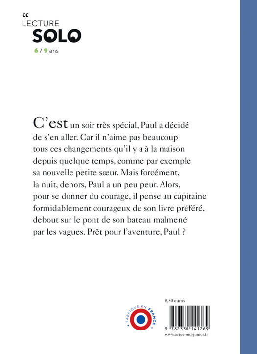 C'est un soir très spécial, Paul a décidé de s'en aller. Car il n'aime pas beaucoup tous ces changements qu'il y a à la maison depuis quelque temps, comme par exemple sa nouvelle petite soeur. Mais forcément, la nuit, dehors, Paul a un peu peur. Alors, pour se donner du courage, il pense au capitaine formidablement courageux de son livre préféré, debout sur le pont de son bateau malmené par les vagues. Prêt pour l'aventure, Paul ?